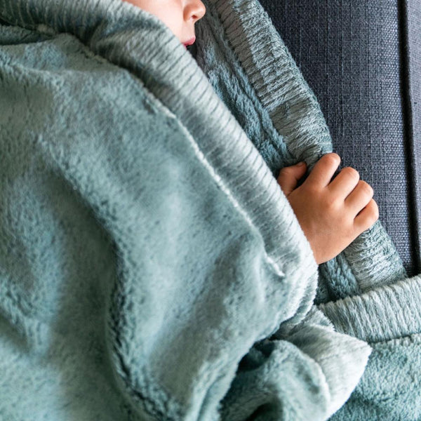 A little boy sits under a Luxury Toddler Eucalyptus Colored Lush Saranoni Blanket. The soft blanket is a toddler blanket or baby blanket.