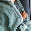 Toddler boy snuggled with Saranoni Lush Toddler Blanket in Mineral Blue.