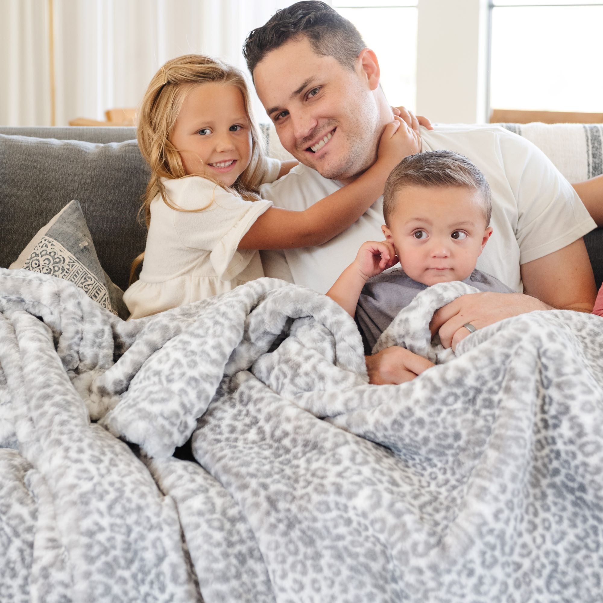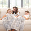 A mother and her daughter and a Saranoni blanket, specifically the tan marbled faux fur/minky extra large blanket, highlighting its ultra-soft texture and luxurious design. This plush blanket features a dual-texture blend of silky minky and cozy faux fur, creating the ultimate cozy blanket for home decor. Perfect luxury blanket for lounging or adding style to any space. Soft blanket, cozy blanket—experience unmatched warmth with a Saranoni blanket.